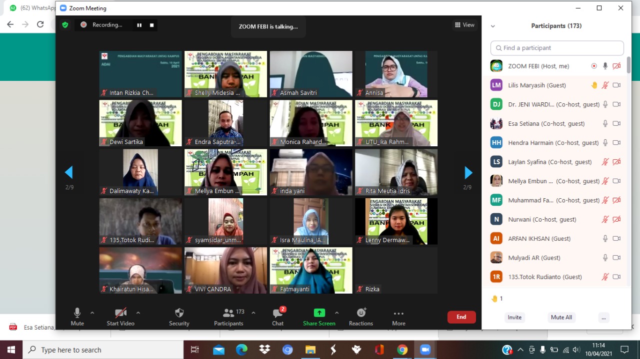 Even DPP ADAI April 2021. Pada tanggal 10 April, ADAI sukses menyelenggarakan Acara Pengabdian masyarakan ADAI dengan tema Green Accounting: Pemanfaatan Bank Sampah dalam Meningkatkan Perekonomian Masyarakat. Pengabdian Masyarakat mengambil tempat di Bank Sampah Unilak yang dilakukan via zoom. Acara diikuti ratusan Dosen Akuntansi yang tersebar dipuluhan Perguruan Tinggi di Indonesia. Tema green accounting ini menjafi fokus kajian dan pengabdian dikalangan Dosen kampus yang tergabung dalam Asosiasi Dosen Akuntansi Indonesia, karena upaya mendukung perlindungan terhadap bumi kita. Hadir sebagai Narasumber yaitu Bapak Dr. Arfan Ikhsan Lubis (DPP ADAI) dan Dr. Jeniwardi (dari ADAI Riau). Diskusi dan pembahasan hal-hal teknis penerapan bank sampah pada wilayah masing-masing menjadi antusiasme peserta pengabdian.